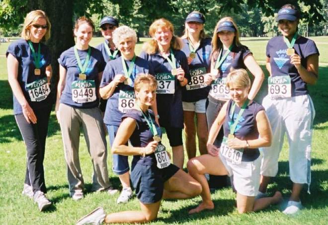 The 2004 Flora Light Women’s Challenge, in Hyde Park, raised £1518. Leading from behind, Margaret shepherded her team of Sue, Kate, Rachel, Diane, Emma and the Entertainer Trotters (Julie, Irene, Tracey and Lucy) round the course! |
